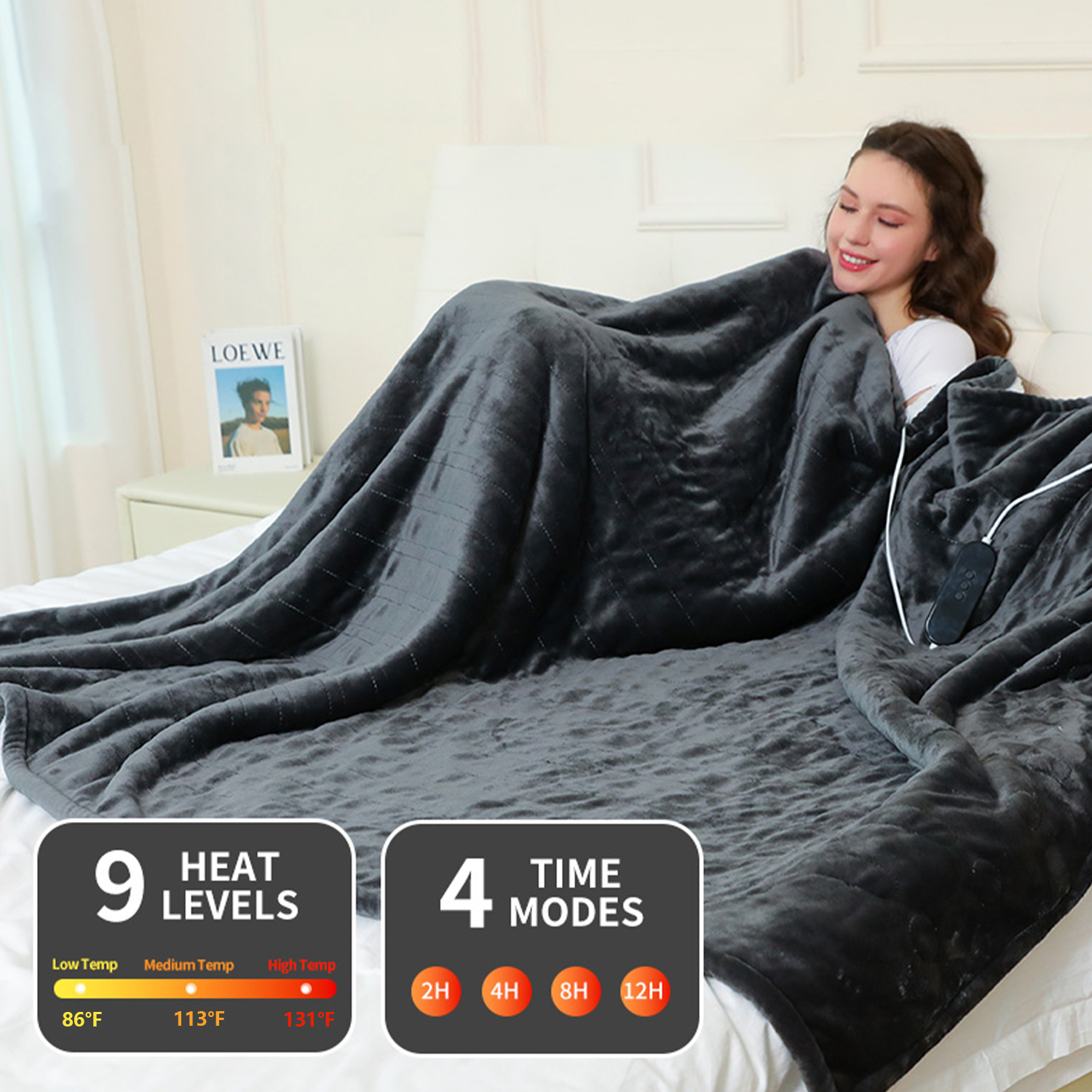The Fastdealmall Heated Blanket offers nine heat settings with temperatures ranging from 86°F to 131°F, allowing you to select your ideal comfort level for any situation or preference.