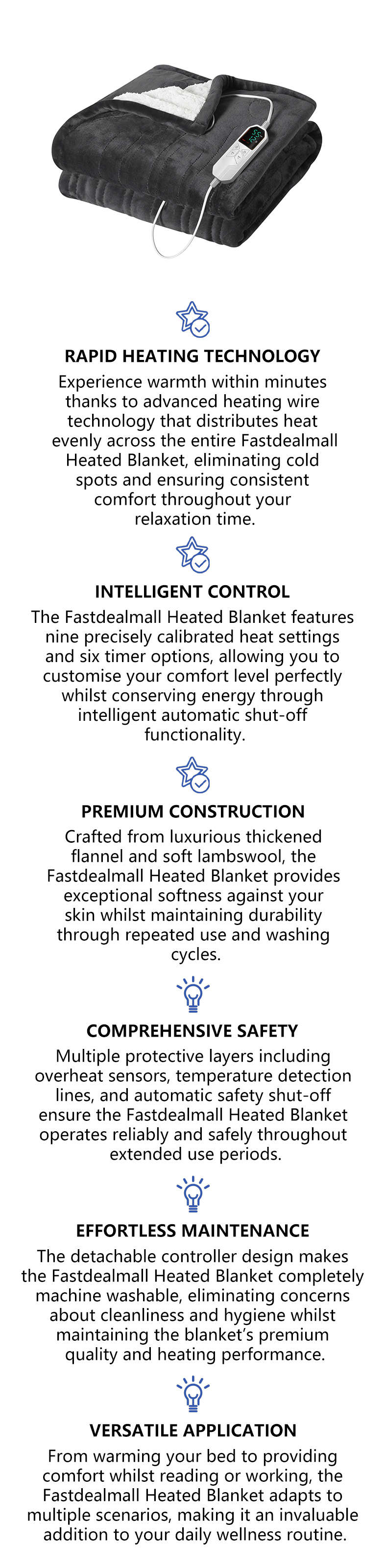The Fastdealmall constant-temperature system delivers precise, full-body heating for an intelligent warmth experience. You can choose different timer settings (1–12 hours) based on your needs, and the system will run automatically without constant adjustments. As one of our six core advantages, the constant-temperature feature ensures every use provides the most comfortable and personalized warmth.