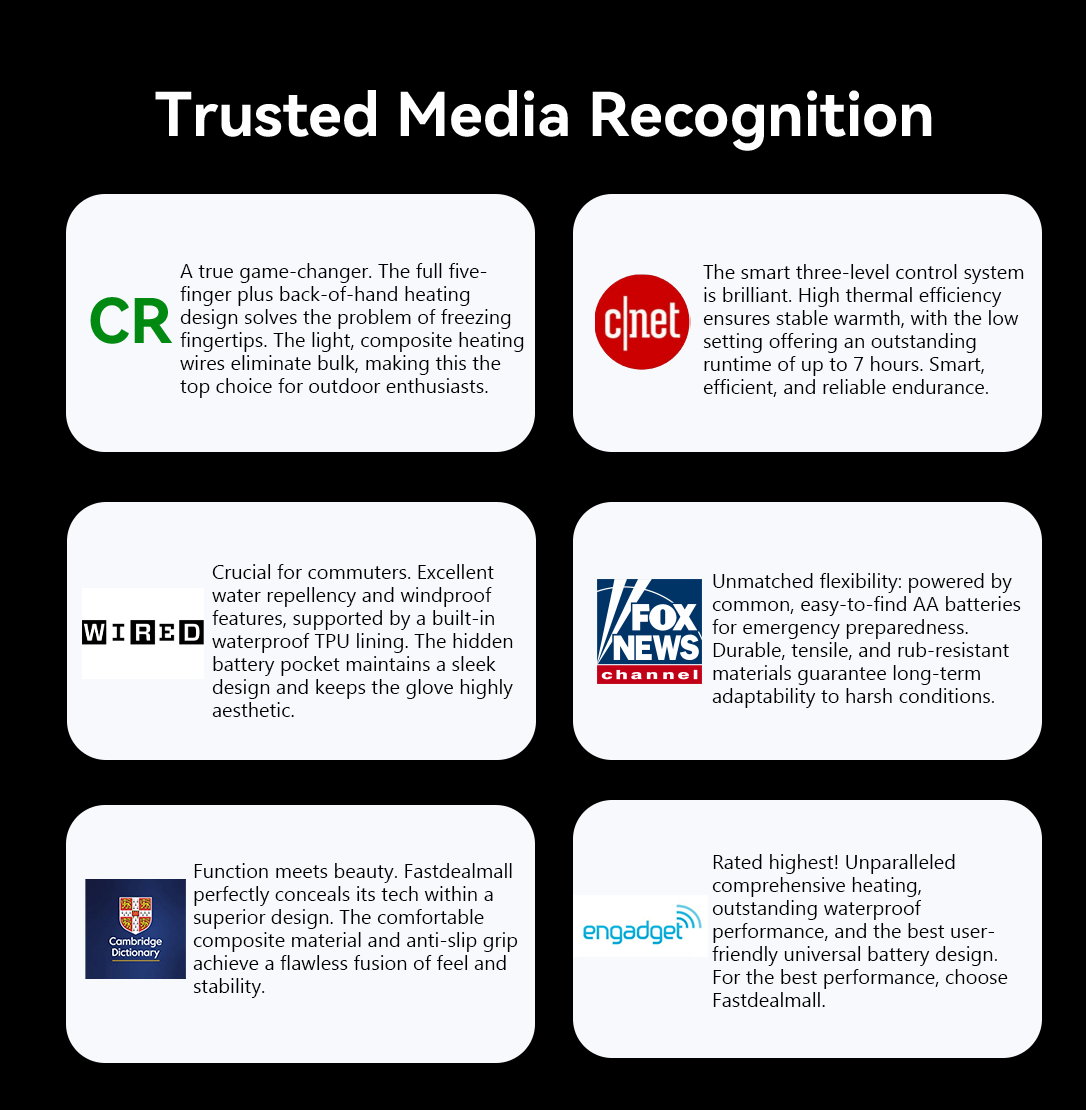 Fastdealmall prioritizes portability, practical design, and reliable warmth. Core features include full-finger heating, adjustable temperature settings, and waterproof protection – providing effortless, instant warmth anytime, anywhere.